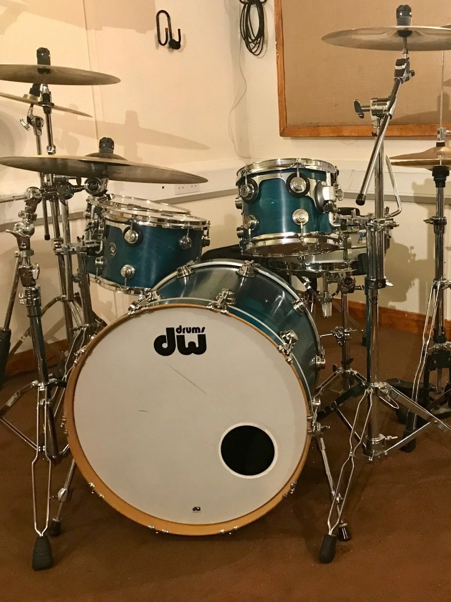 A DW Collector’s drum kit is set up with a Ludwig Acrolite snare drum and include good quality cymbals